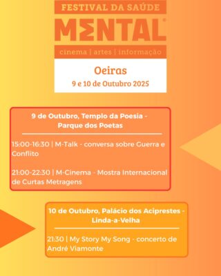 ▪️ O festival compreende uma M-Talk dedicada ao tema Guerra e Conflito que terá lugar no dia 9 de outubro, no Templo da Poesia, em Oeiras, pelas 15h e, posteriormente, pelas 21h, uma mostra internacional de curtas-metragens.
